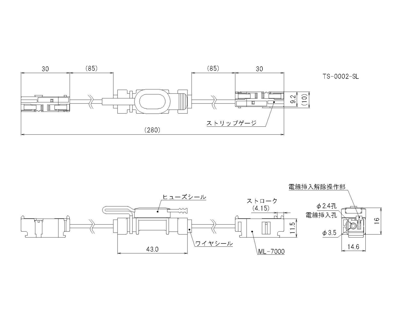 中継可能電線範囲:単線Φ0.4mm~Φ1.6mm (AWG26~AWG14)、撚線0.2スケア~2.0スケア(AWG24~AWG14) 素線径Φ0.18mm以上 ・標準剥き線長:10mm