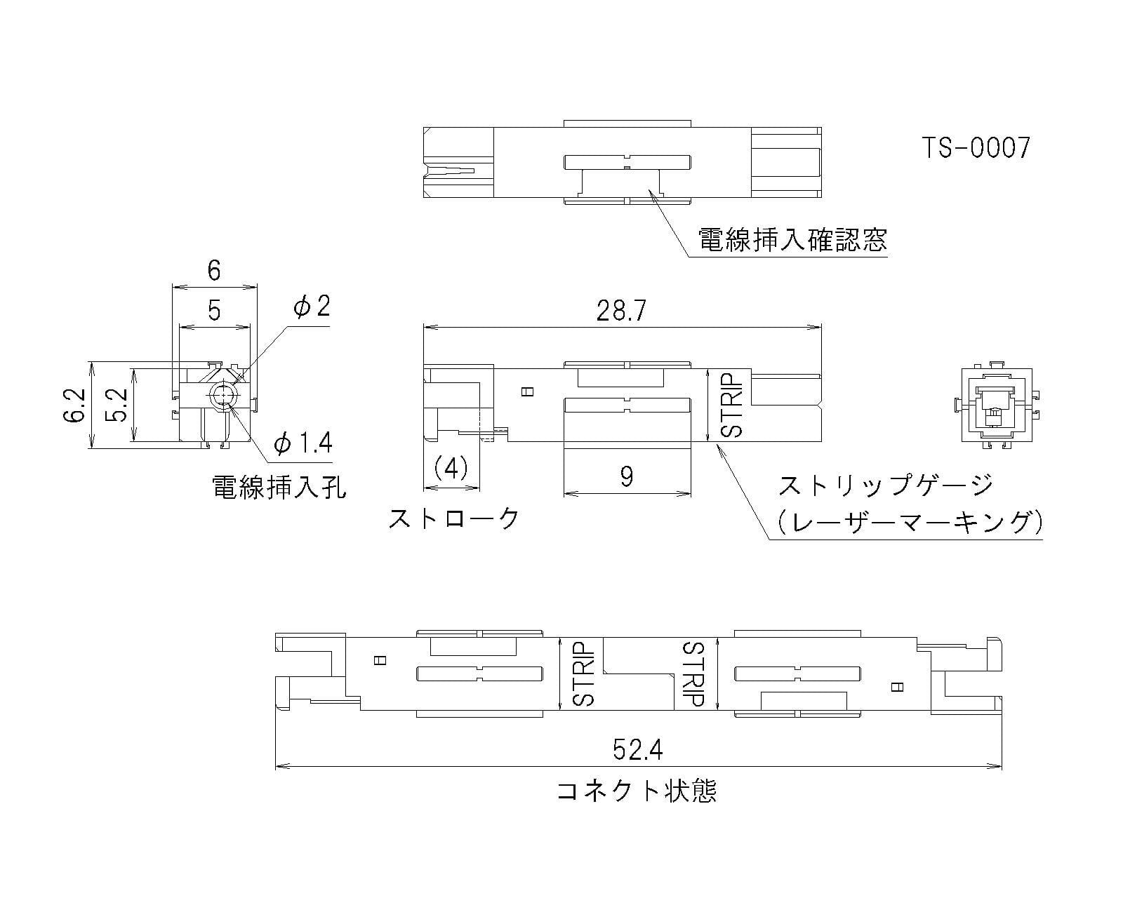 定格:50V-1A ・ 耐電圧:AC1000V(1分間) ・ 絶縁抵抗:DC500V,100MΩ以上 ・ 使用可能電線範囲:撚線0.08スケア~0.12スケア(AWG26~AWG28) 電線仕上外径Φ1.3mm以下 ・ 標準剥き線長:5mm~7mm